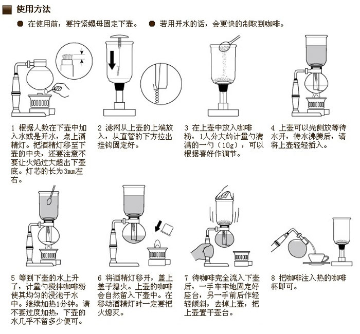 1、将热水装过虹吸壶下座,点燃酒精灯或瓦斯炉烧煮,每杯的水量约为120CC左右,(下瓶装热水者,一定要用布擦干底下的水分)。