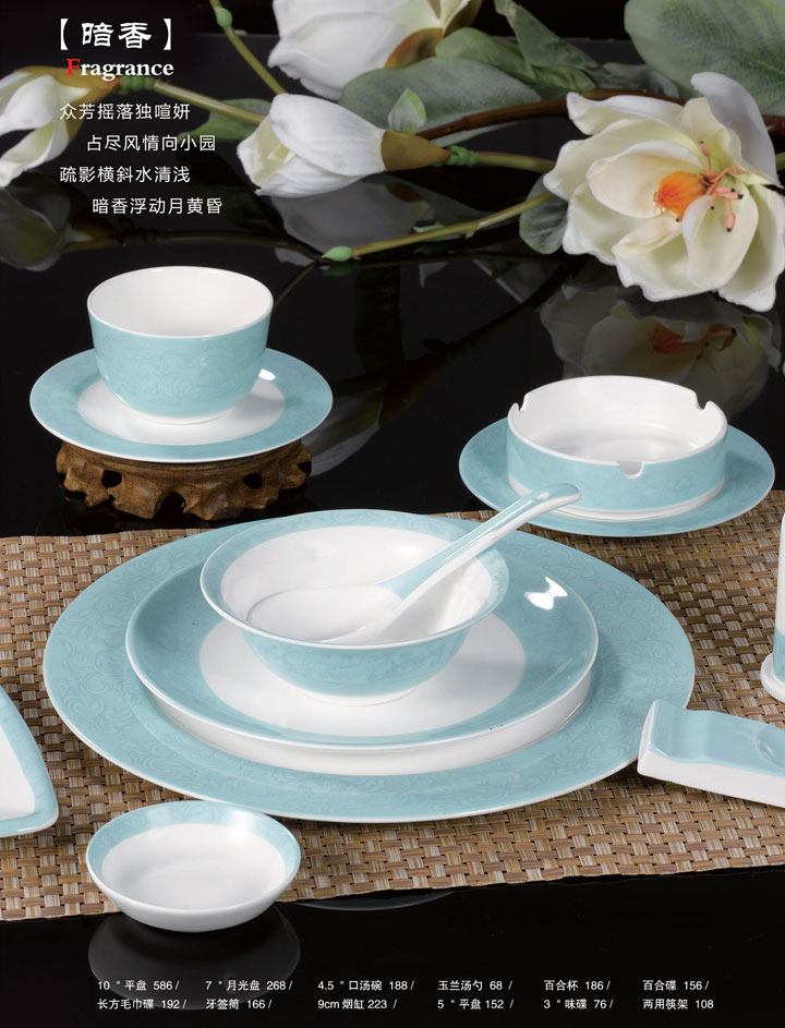 10寸平盘、7寸月光盘、4.5寸口汤碗、玉兰汤勺、百合杯、百合碟、长方毛巾碟、牙签筒、9cm烟缸、5寸平盘、3寸味碟、两用筷架。