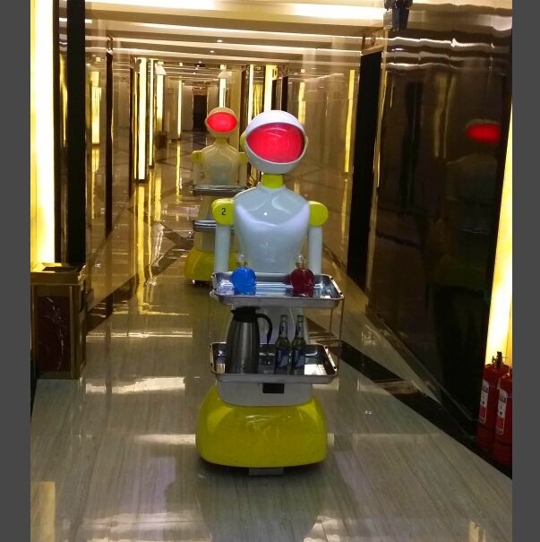 送餐机器人俗称智能运输机器人,是将做好的餐饮产品按时送到指定的餐桌的服务,该机器人具有自主行走能力,并且自主躲避障碍物等相关的安全防护措施。机器人在检测到已放置食物,并接收到送餐桌号指令后,将自动沿磁条行至对应桌号的餐桌,旋转90度面向顾客,同时发出语音提醒(可自行设置所发语音),待检测到顾客已将食物取下后,将原地旋转回轨道,并返回取餐点待命。在行走途中,如果遇到障碍物,机器人将会发出语音提醒。
